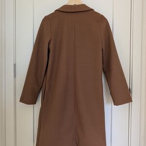 Cozy teddy-style jacket with a relaxed, open front. Soft textured fabric for comfortable layering. Clean silhouette with subtle shoulder structure. Versatile warm brown shade for everyday wear.