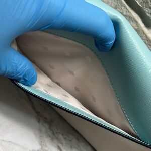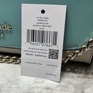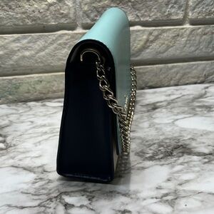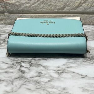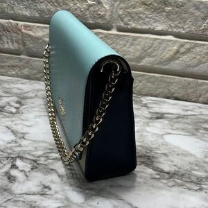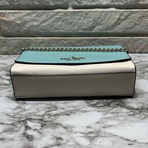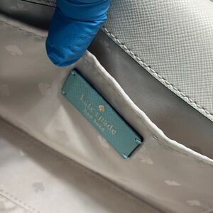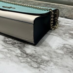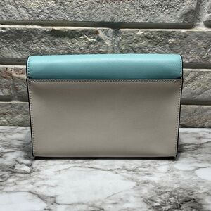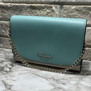 Kate Spade Carson Convertible Crossbody handbag in the Poolside Multi (turquoise and light beige/grey colorblock) color. It is made from saffiano leather and features gold-tone hardware.