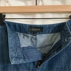 This item is a Talbots denim pencil skirt featuring lightweight fabric and embroidered details.