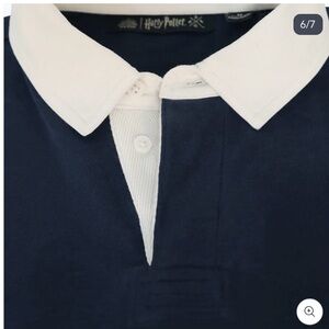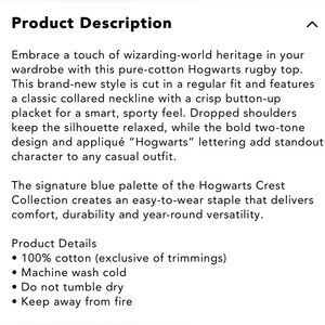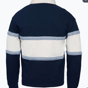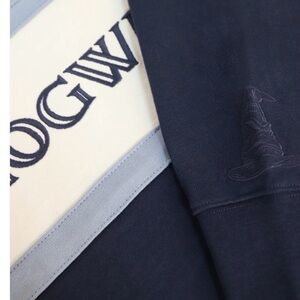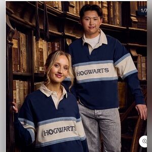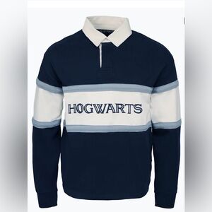 Classic rugby pullover with bold "HOGWARTS" chest embroidery. Navy body with cream and light blue horizontal stripes. Collared neckline and long sleeves. Comfortable, preppy look.