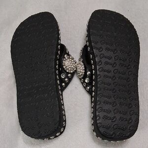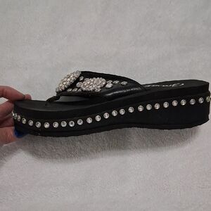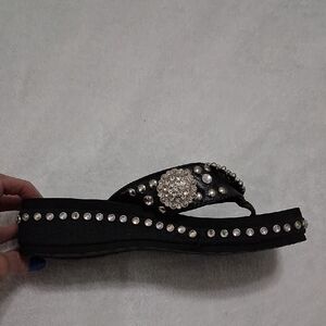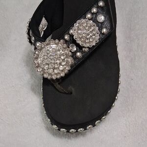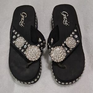 Chic black sandals by Grazie. Adorned with sparkling silver accents. Perfect for a glamorous look.