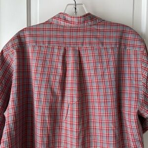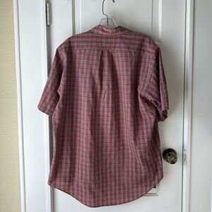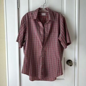 Classic button up short sleeve by Hathaway. Red, white, blue plaid pattern. Features include a neck collar with buttons that goes up all the way up and down to the hem. One front patch pocket for any essentials. Can be dressed up as causal or layering altogether. Perfect for spring/summer outings.