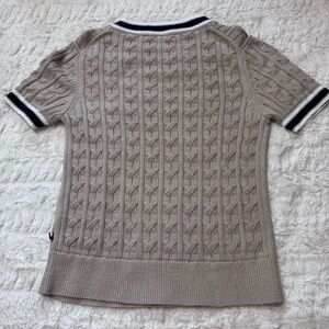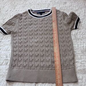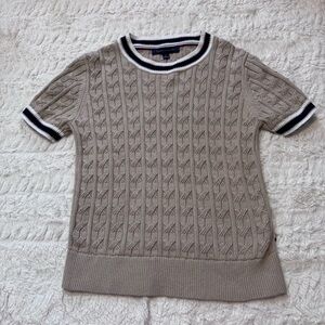 Classic Tommy Hilfiger short sleeve cable knit sweater in a timeless khaki / beige neutral tone. This piece features a beautiful all-over cable knit texture and signature Tommy Hilfiger white and navy striped athletic-style trim along the neckline and sleeves for that iconic preppy look.