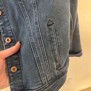 Elevate your style with this classic denim jacket. Perfect for any casual outing, this blue jacket offers both comfort and fashion. Worn only once. Like new condition. Slight stretch as well!