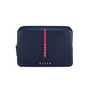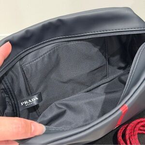 Sleek Prada glass waterbottle in navy with red cord strap for hands-free carry. And Prada pouch with vertical Prada logo for a modern look. Lightweight and stylish for everyday use.