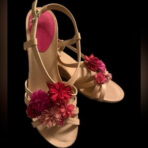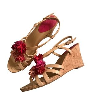 Tahari Beige wedge heel Sandals with Pink red Floral Accents