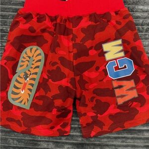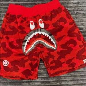 BAPE men’s shorts in vibrant red shark camo. Bold shark face graphic on the front for standout style. Elastic waistband for comfortable everyday wear.