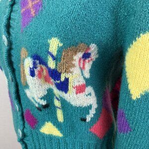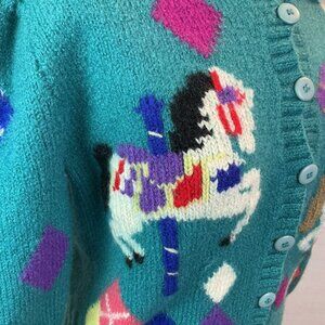 vintage sweater, hand-knit cardigan, retro sweater, Borek sweater, wool cardigan, teal sweater, fairground fashion, button-up cardigan, whimsical sweater, Uruguay-made sweater, carnival sweater, colorful knitwear, carousel horse sweater