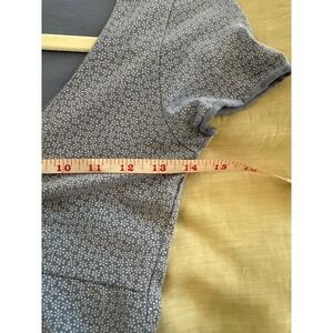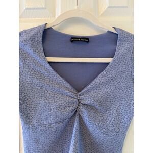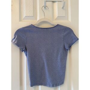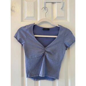 Captivating with its delicate floral charm, this Brandy Melville top elevates your everyday style. The soft blue fabric is adorned with a subtle white floral pattern, while the ruched V-neckline adds a touch of flattering detail. Short sleeves offer a comfortable fit. This piece is perfect for brunches with friends or a casual day exploring the city.