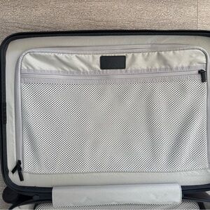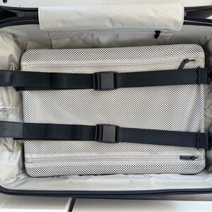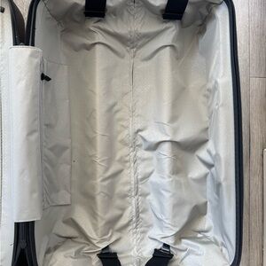 Interior features: Built-in compression pad with antimicrobial laundry bag. NOTE: luggage does not come with shoe bags or luggage tag.