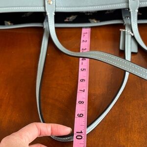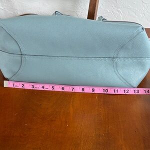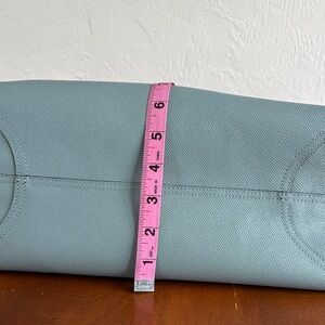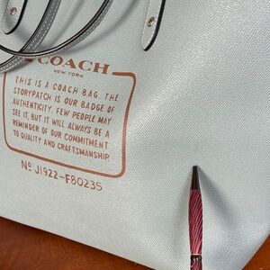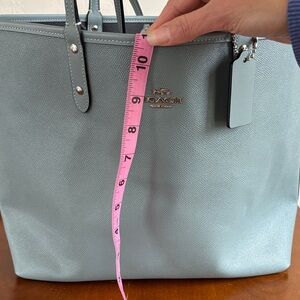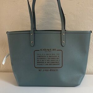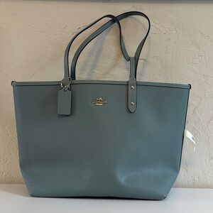 Chic Coach tote in slate blue leather with Coach logo as one option.