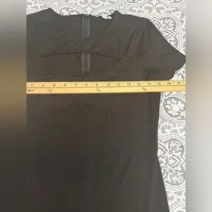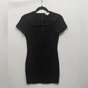 Figure-hugging mini dress with a bold chest cutout. Short sleeves and a sleek silhouette. Modern, versatile piece for nights out.