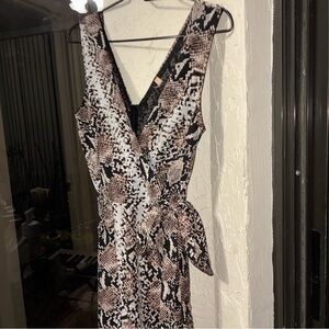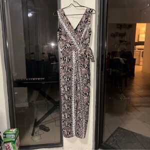 Sleeveless jumpsuit in a neutral brown snake-print. Features a V-neckline and self-tie waist for a tailored look. Lightweight fabric offers comfortable all-day wear. Stylish neutral brown tones pair easily with sandals or heels.👠