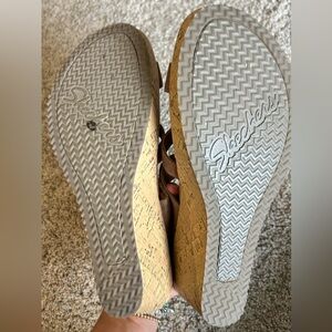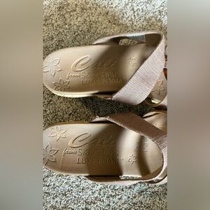 In excellent condition. Put a ring on a smart tailored sunny-day style with added lightweight comfort in these Skechers Cali Beverlee - Sail Away sandals. Luxe Foam cushioned contoured comfort footbed Cork wedge heeled dress casual thong sandal design 2 1/4 inch total wedge heel height 1/2 inch platform height at forefoot #08.25.09