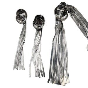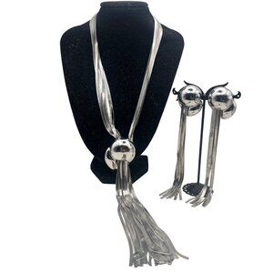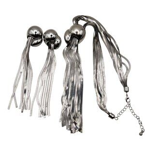 A sleek silver-tone set featuring a tassel necklace and matching earrings. Lightweight and adjustable for versatile styling options.