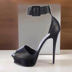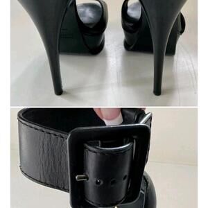 The Yves Saint Laurent Platform Black Sandals in size 36.5/US 6.5 are a stylish and trendy choice for women. Featuring a solid black color, round toe shape, and ultra high stiletto heel, these sandals are perfect for those who want to make a statement. The buckle closure and adjustable ankle strap offer a secure and comfortable fit, making them suitable for a variety of occasions. Designed by the renowned brand Yves Saint Laurent, these platform sandals are a must-have for any fashion-forward woman looking to add a touch of luxury to her footwear collection.