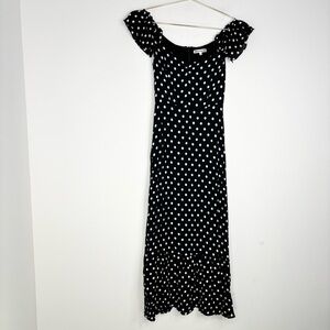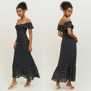 Reformation Black Polka Dot Off-Shoulder Midi Dress