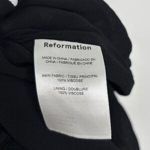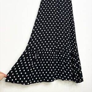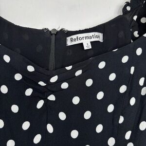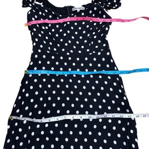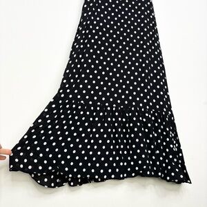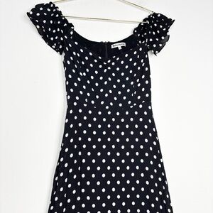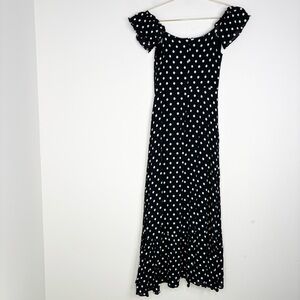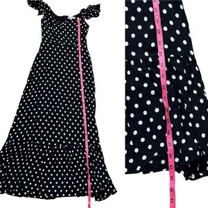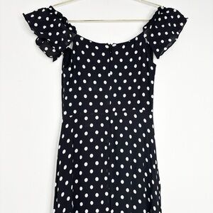 Elegant off-shoulder midi dress by Reformation. Black fabric with white polka dots. Fitted waist and flowing skirt. Feminine ruffle sleeves. Polished, timeless silhouette.