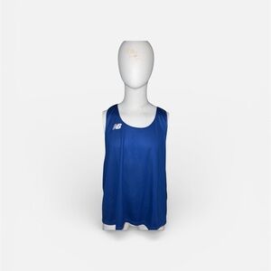 Breathable blue performance tank with racerback cut. Features New Balance logo on chest. Smooth, lightweight fabric for training and runs.