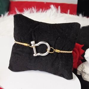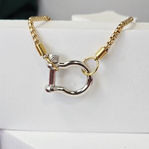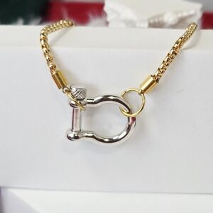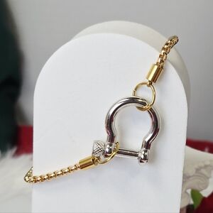 Chic mixed-metal chain bracelet featuring a polished stainless steel horseshoe shackle carabiner paired with an elegant 18K gold-plated box chain. The twist-pin shackle closure allows easy wear and also lets you add charms for a customizable look.