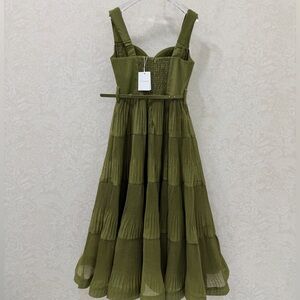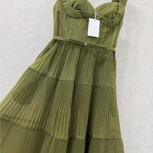 Zimmermann tiered midi dress in olive green. Square neckline with wide straps. Fitted bodice and belted waist. Flowing pleated tiers for movement. Lightweight textured fabric.