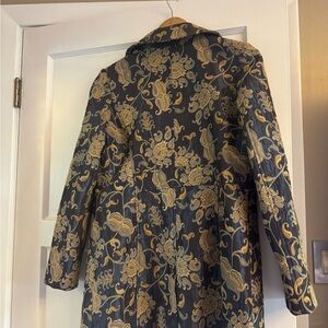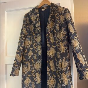 Chic blazer brocade with intricate floral design. Navy blue base with gold accents. Ideal for stylish occasions.