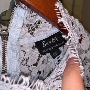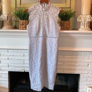 Bardot Fitted Blue Lace Paneled High Neck Cocktail Midi Dress Size Small. Zip closure. Gently used.