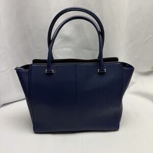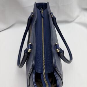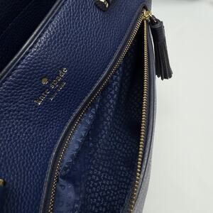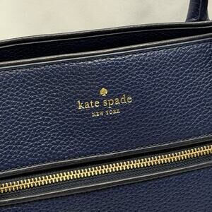 Classic Kate Spade New York pebbled leather satchel in a rich blue tone with gold-tone hardware. Features dual top handles, structured silhouette, front zip pocket with tassel pull, and spacious interior with signature Kate Spade lining. Stylish and practical for everyday use or work.