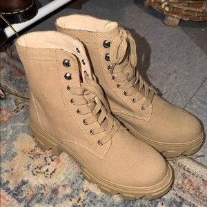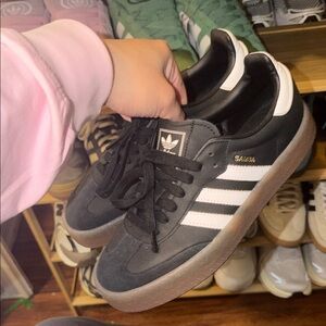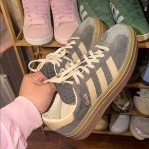 Adidas Gazelle sneakers in gray and tan. Features signature stripes and lace-up style. Barely worn true to size and comfortable