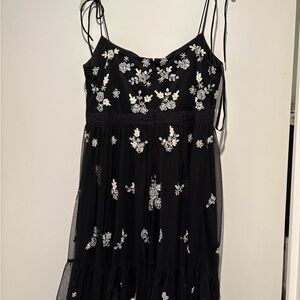 Black cocktail dress with delicate white and cream floral beading. Bow detail on the straps. Feminine, flowy silhouette. Elegant embroidered details throughout.