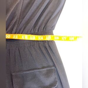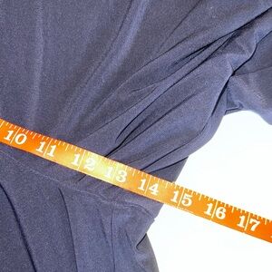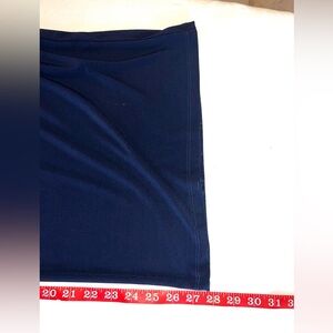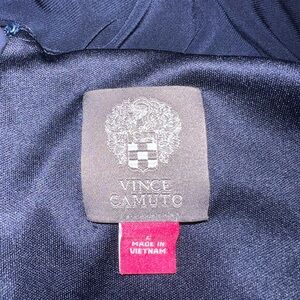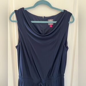 Luxurious midnight blue fabric by Vince Camuto. This Vince Camuto jumpsuit is a wide leg size large versatile and stylish for casual office and church wear. It has a cowl neck line and zip closure and sleeveless arms. Made from a blended fabric with an elastic waist for comfort. it is ideal for all seasons and includes pockets. The wide leg, silhouette and belted waist give it a flattering fit. It is machine washable with polyester material, making it easy to care for.