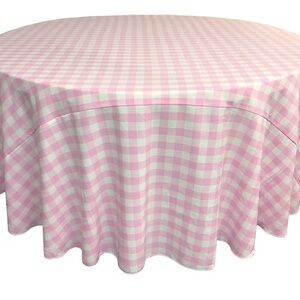 Soft pink gingham round tablecloth for everyday dining. Adds a fresh, cheerful look to your table. Made for easy styling and coordinating with many decors. Pink color brightens your dining space. Great for strawberry themed parties we used these on our high cocktail tables