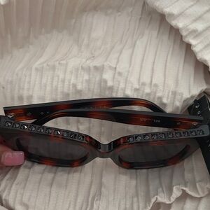 Stylish sunglasses with bold tortoise and black frames. With an edgy spiked detail at the top….Perfect pop to add to any outfit