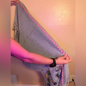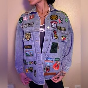 Light wash denim jacket covered in colorful embroidered patches. Features a variety of graphic and slogan patches including a tiger, "YOLO", and themed icons. Vibrant and playful look. Easy to style over tees.