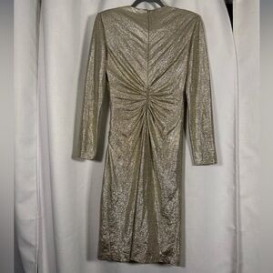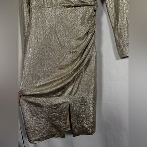 Eliza J Metallic Long Sleeve Sheath Dress in Champagne Gold. Look ravishing in ruching with this metallic sheath dress from Eliza J. Round neckline. Back zip closure. Ruched at front; slit at side. Long sleeves. Lined. Size 8.