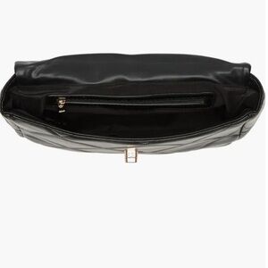 Structured quilted crossbody in black leather. Polished gold chain strap and logo accent. Flap closure with secure magnetic fastening. Sleek silhouette for day or evening wear.