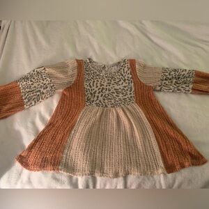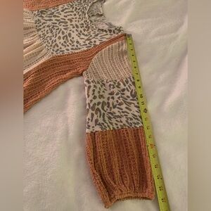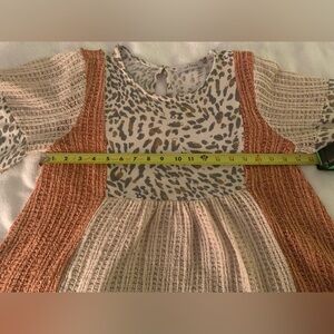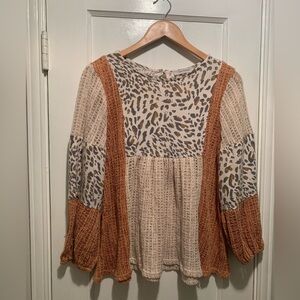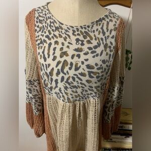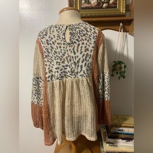 Boho Patchwork Mixed Print Babydoll Top, Crochet Trim Leopard Print Blouse, Color Block Textured Peasant Top. Elevate your boho chic look with this unique patchwork blouse that features an eye-catching mix of leopard animal print, solid burnt orange/rust panels, and delicate cream-colored crochet or thermal knit textures. Loose sweater weave that is sheer as seen in photos. Size/fabric tag is faded, based on measurements I’d estimate it to be a L but make sure you check out the flat measurements in the photos to make sure of fit.