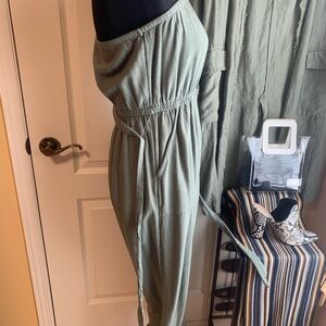 One-shoulder jumpsuit with a relaxed fit. Elastic neckline and waist tie for shape. Soft, drapey fabric for easy wear. Casual yet polished look for day or night.