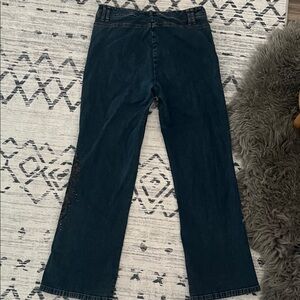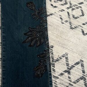 Flared Jeans with leg and pocket details featuring intricate black and copper embroidery.