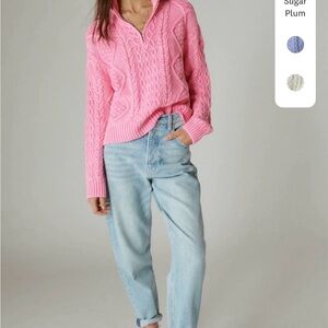 Cozy and stylish Lucky Brand cable knit sweater in the beautiful color Washed Sugar Plum, a vibrant hot pink tone that adds the perfect pop of color to your wardrobe. This sweater features a textured cable knit design throughout, a quarter zip front, and a slightly relaxed fit that makes it perfect for layering or wearing on its own.