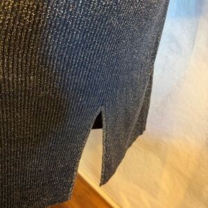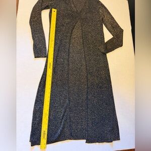RAFAELLA black & gold long sleeve cardigan with a longline silhouette. Open front with 3 upper hooks closure & slit sides. 75% silk, 12% lurex, & 13% viscose. Perfect for layering, or over a formal outfit. Pre owned in excellent condition.