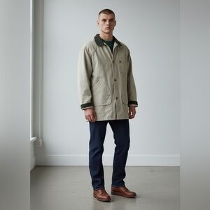 Light khaki color with green corduroy collar and corduroy lined cuffs