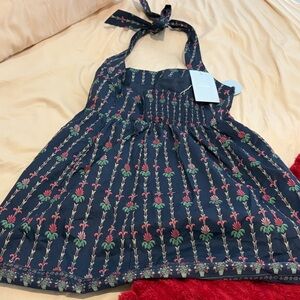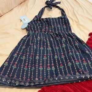 Halter dress with a tied neck. Navy background with red and green floral motif. Feminine and easy to style. Smooth, lightweight fabric with delicate print.