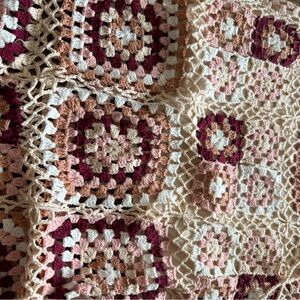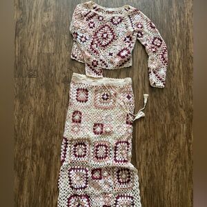 Crochet long skirt and matching long-sleeve crop top. Openwork granny square design. Soft cream base with mauve and dusty rose accents. Boho beach or festival outfit.