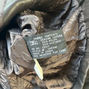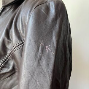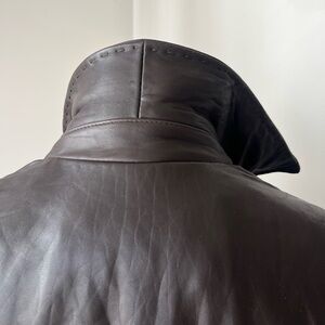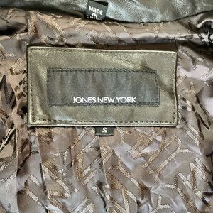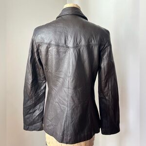 Jones New York fitted leather jacket in a rich dark chocolate brown. Soft genuine leather with exposed seam detailing, full zip front, classic collar, and two pockets. Fully lined.