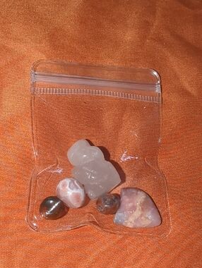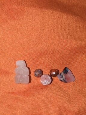 Small assortment of tumbled stones in pink, rose, white and brown tones. Great for collecting or display. Assorted stones include a pinkish stone with black inclusions and a brownish-white stone, likely varieties of agate.