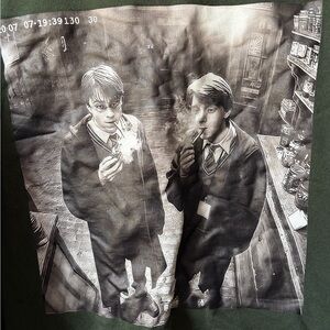 Edgy black and white graphic print featuring a "smoking wizards" aesthetic.
