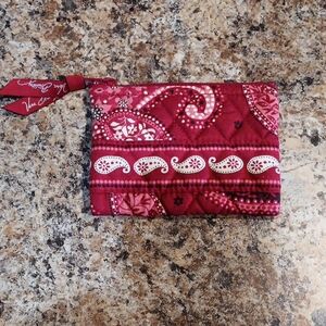 Quilted Vera Bradley wristlet pouch in a red paisley print. Zipper top with branded ribbon pull. Slim design holds cards, cash, and small essentials. Lightweight and easy to carry.