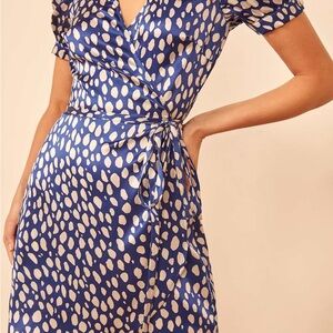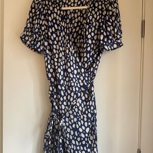 Chic mini dress with a wrap design. Features a blue base with white polka dots. Perfect for casual outings.