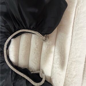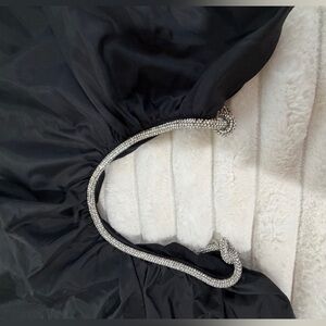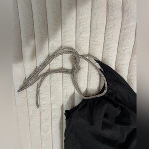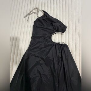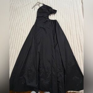 Sleek one-shoulder evening gown by STAUD. Features a side cutout and a sparkling rhinestone halter tie. Flowy skirt for elegant movement. Minimal, refined silhouette for formal occasions. Fits perfectly sizes 6 and 8 . Worn once .